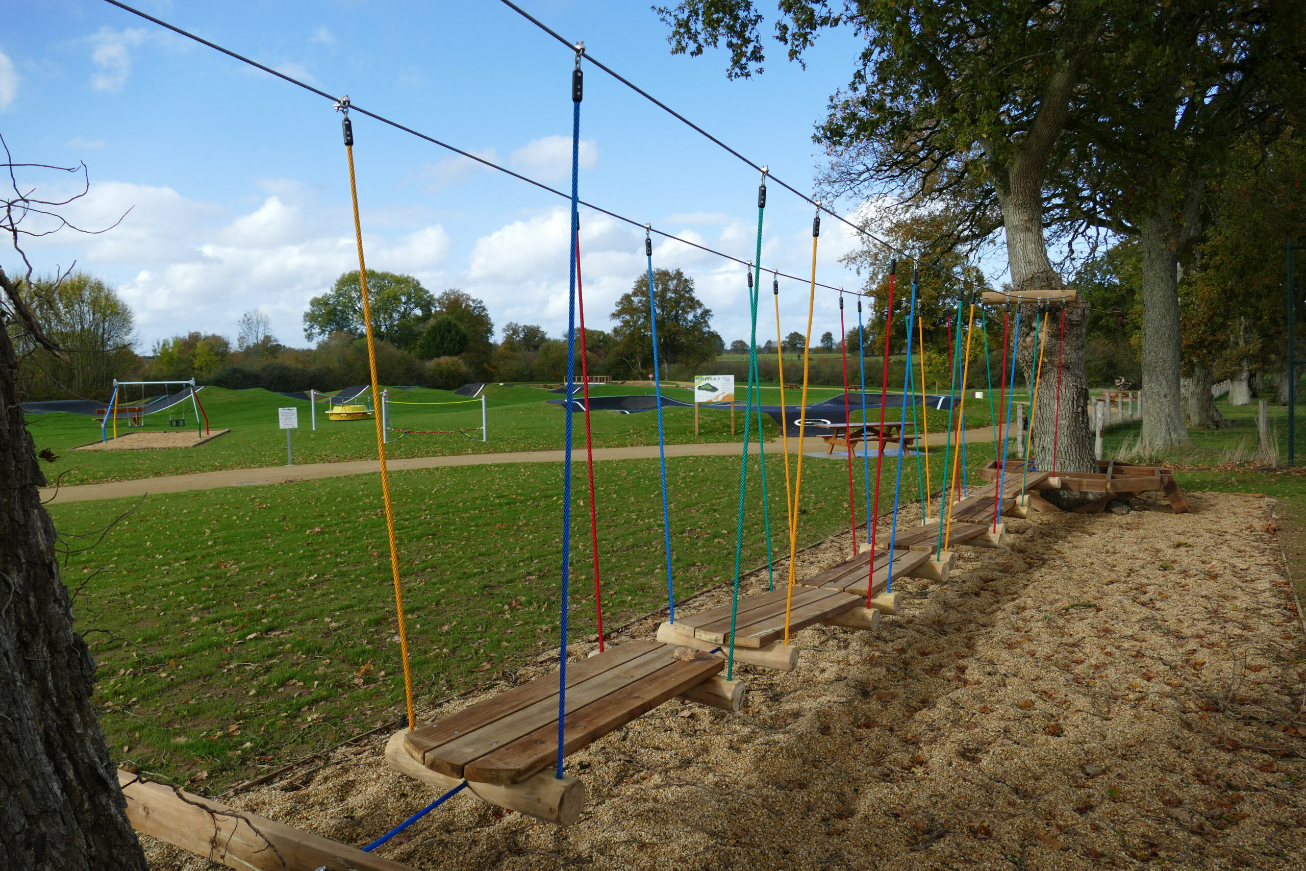 Le parcours accrobranche, intégré dans le paysage grâce aux arbres existants, comprend cinq plateformes et quatre ateliers (troncs suspendus, filet, tyrolienne de 22 m, radeaux suspendus) accessibles dès 6 ans. À proximité, d’autres jeux complètent l’ensemble : un parcours “Marius”, des balançoires, un jeu sur ressort et un tourniquet. Ces éléments constituent un lieu de jeux, de découverte, de partage et de détente adapté aux plus jeunes.