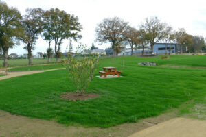 Entouré d’un environnement bocager, le parc comprend 48 arbres (dont 10 fruitiers), 105 arbustes formant une haie champêtre, et environ 3 000 plantes et bulbes pour une flore variée toute l’année. Conçu pour favoriser la biodiversité, le parc propose également des équipements favorisant la convivialité — barbecues, tables de pique-nique accessibles et bancs.
